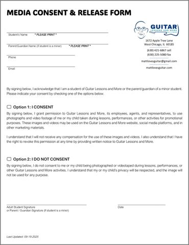 To complete your registration, all new students must download, review, and sign two forms: the Lesson Policy Agreement and the Media Consent and Release Form. These forms are available for download below.