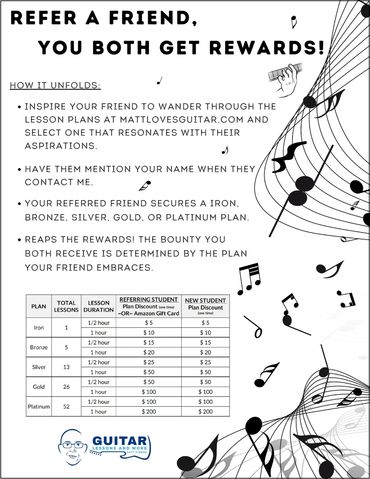 Once your plan is chosen, click on the "Book Your Lessons Now!" button below to fill out the form. Suggest a few options from Monday through Saturday that work with your personal schedule. Please consider your level of expertise, musical interests, and goals. Matt will be in touch via phone or email to temporarily reserve a lesson day and time for you.